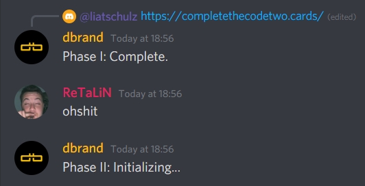 On May 26, 2021, some dipshit in the dbrand Discord server (@liatschulz#7853) found the website https://completethecodetwo.cards by using neuron activation. We have since confirmed that the site was created by dbrand using WHOIS records. dbrand has also confirmed that Phase I has been completed and that Phase II has now been "started". You can view these messages here or refer to Figure 1.